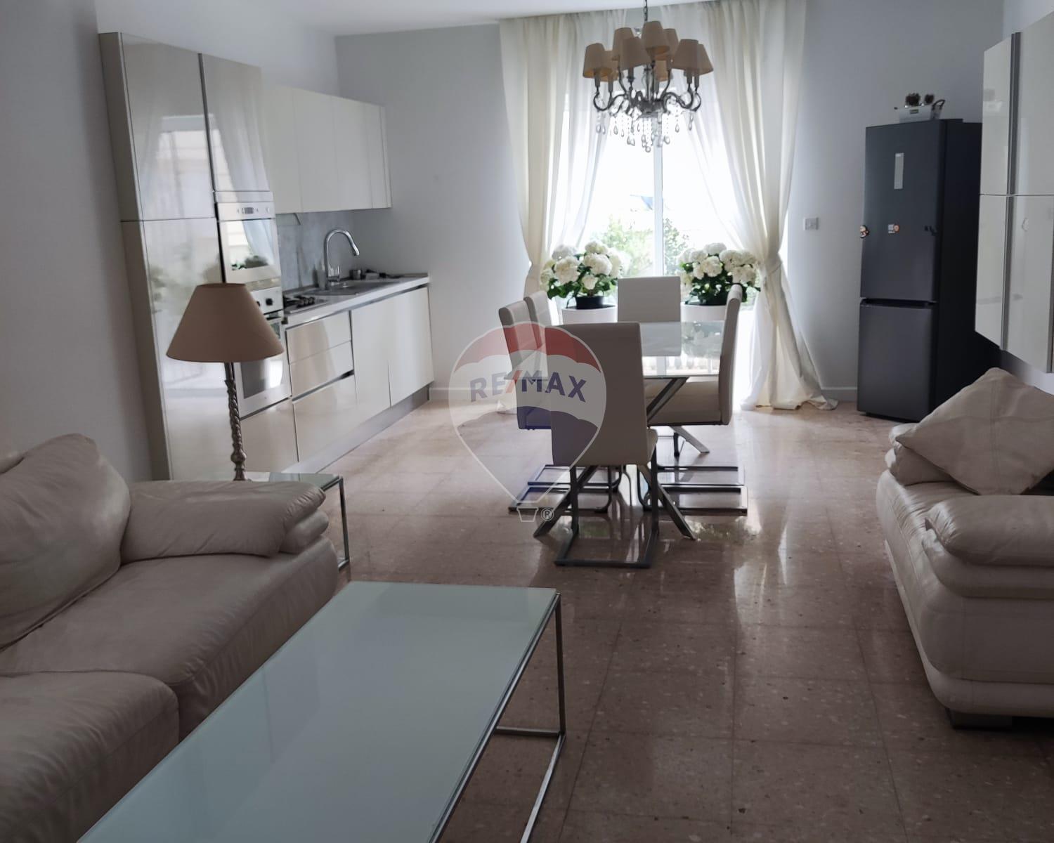 Ta' Xbiex for rent - This modern three-bedroom apartment features a spacious and well-lit layout. Offers an open plan, well-equipped kitchen, dining area and a functional living space.