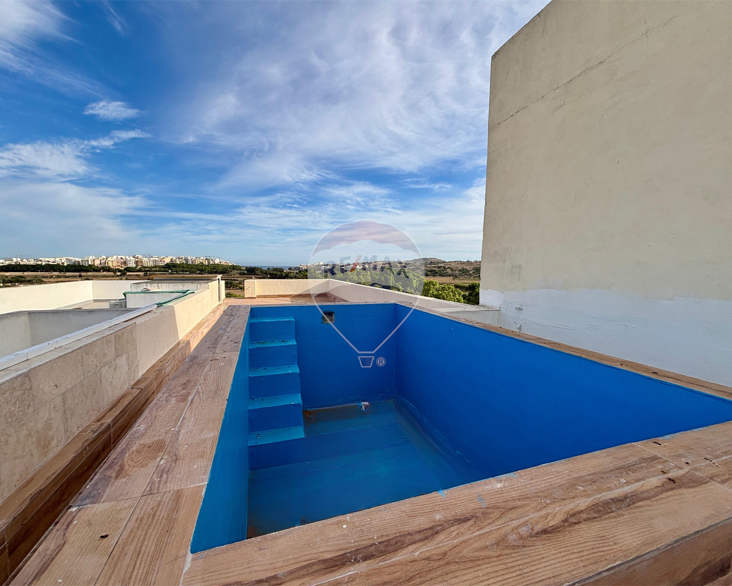 The property offers three bedrooms, one of which includes an ensuite and access to a back balcony, along with a main bathroom. A roof terrace with pleasant views and a swimming pool provides an ideal space for entertaining, and the property also enjoys full airspace rights.
